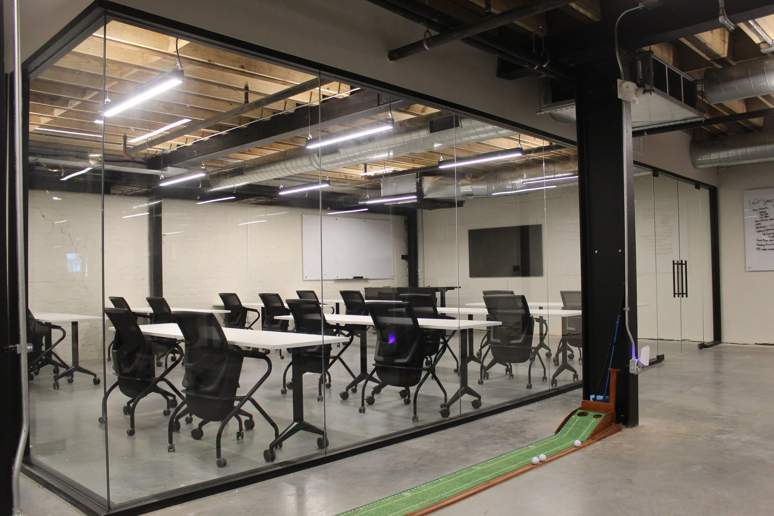 Private meeting classroom for 15+ people in a beautiful modern co-working space. The Classroom is available for rentals including team meetings, off-sites, trainings, workshops, classes, presentations, remote work, interviews, and more!